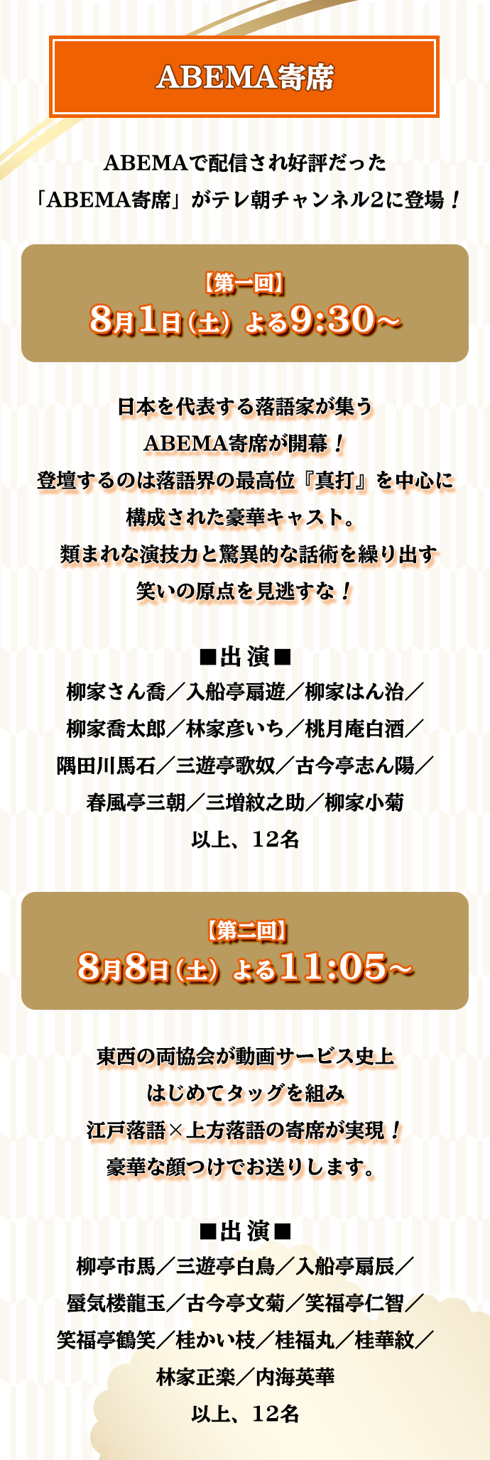 テレ朝チャンネル 落語特集 Abema寄席 桂雀々 三遊亭兼好のginza Sixで落語でごじゃる